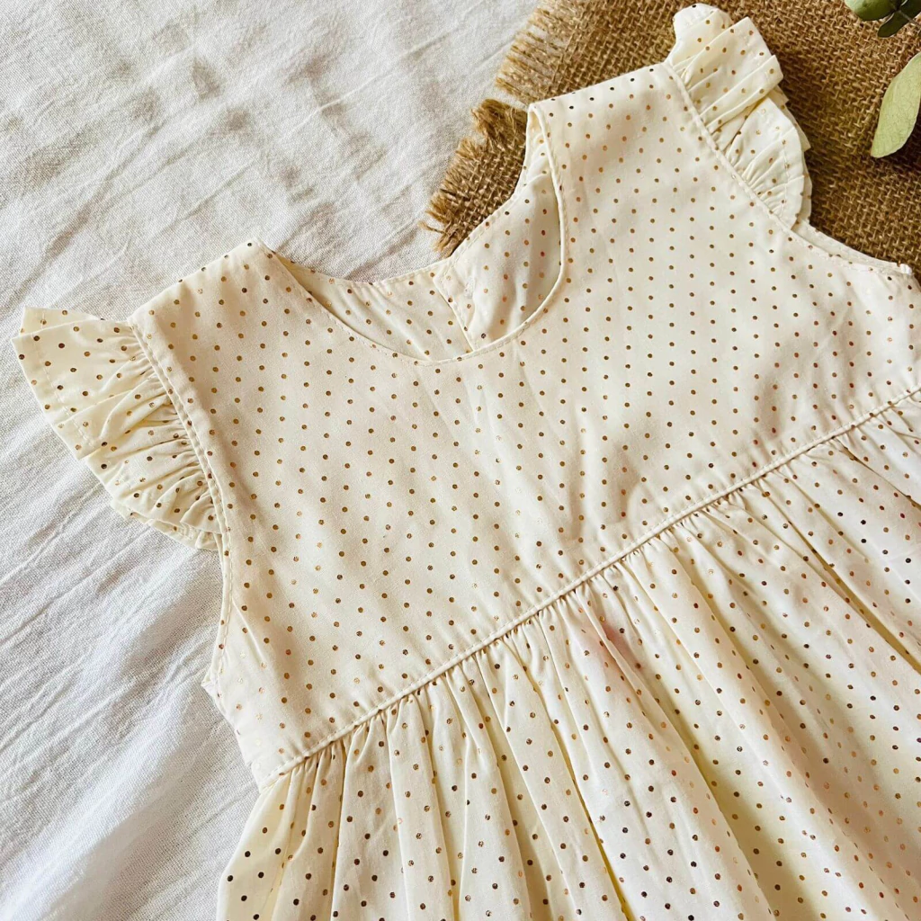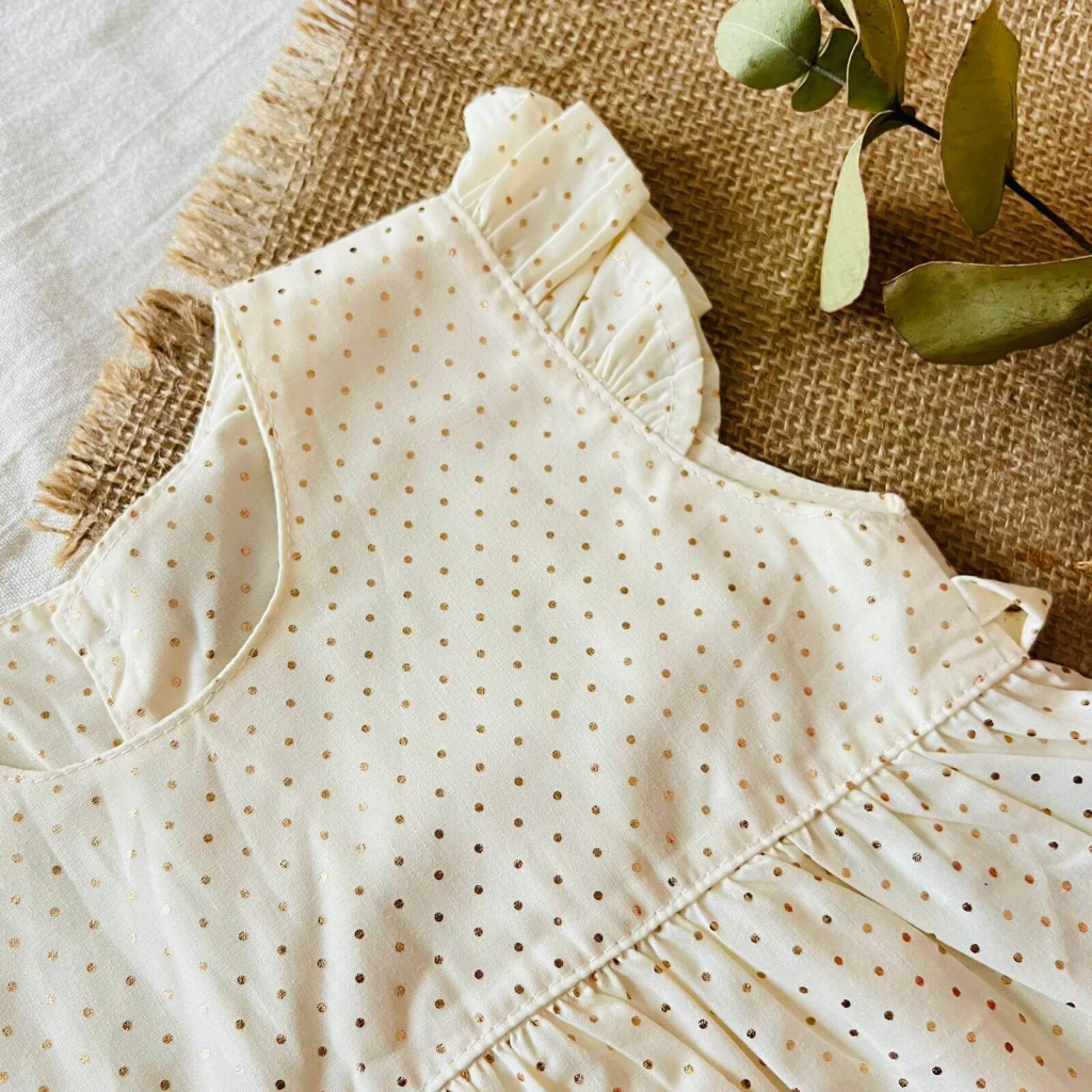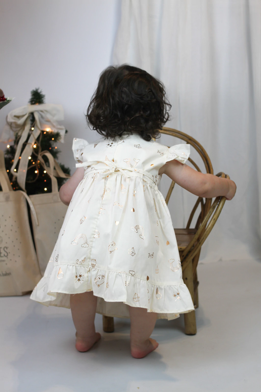 ✨ Vestidito de batista estampado foil dorado gatitos y helados: un clásico de las últimas fiestas que no puede faltar en el guardarropa de tu beba.